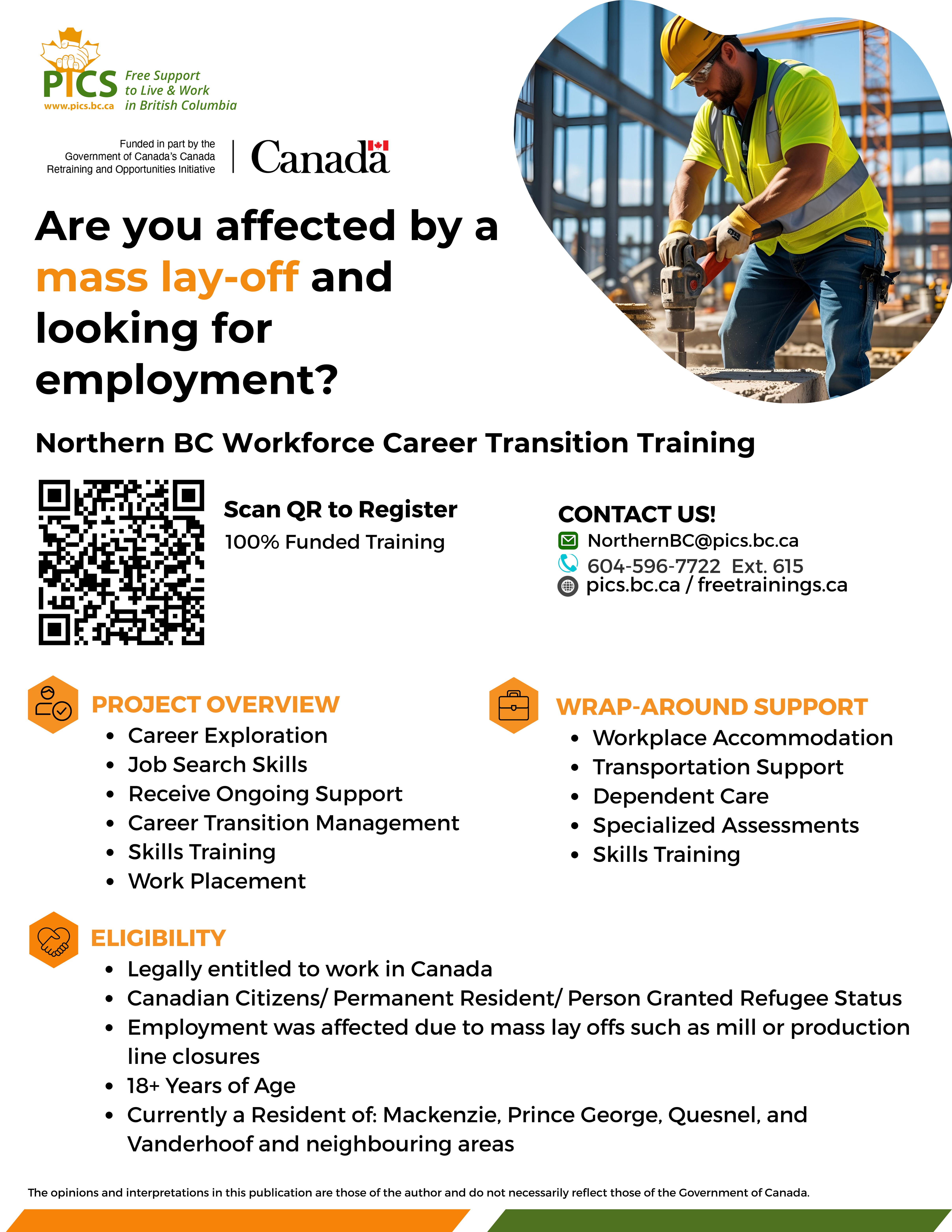 The Northern BC Workforce Career Transition Project is funded in part by the Government of Canada’s Retraining and Opportunities Initiative. The project focuses on supporting workers who were affected by mass lay offs in Prince George, Vanderhoof, Mackenzie, Quesnel and nearby communities. The project will provide skills training opportunities for participants to find meaningful employment.